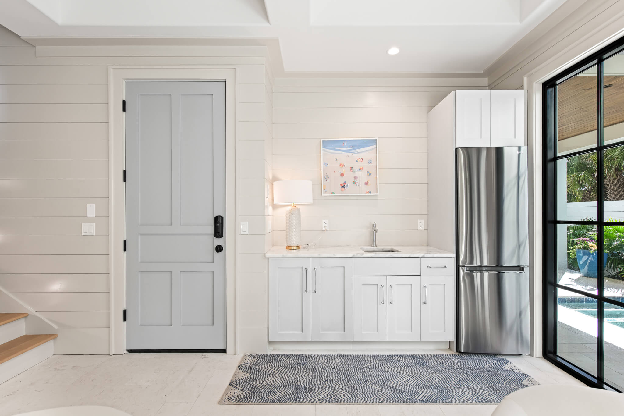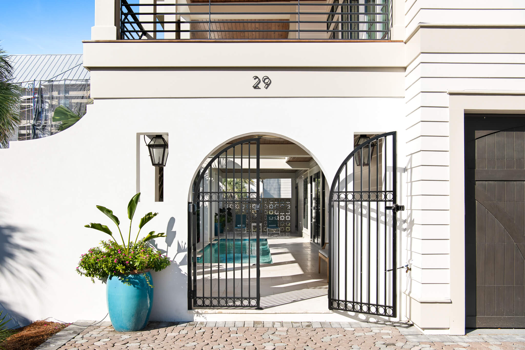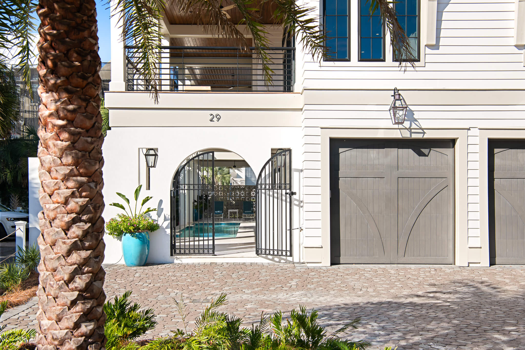 A palm-lined entryway introduces a tranquil private pool retreat, framed by shell- stone terraces and lush tropical landscaping. Inside, an elevator connects all four levels of luxurious living, each thoughtfully composed for gathering, entertaining, and relaxation.