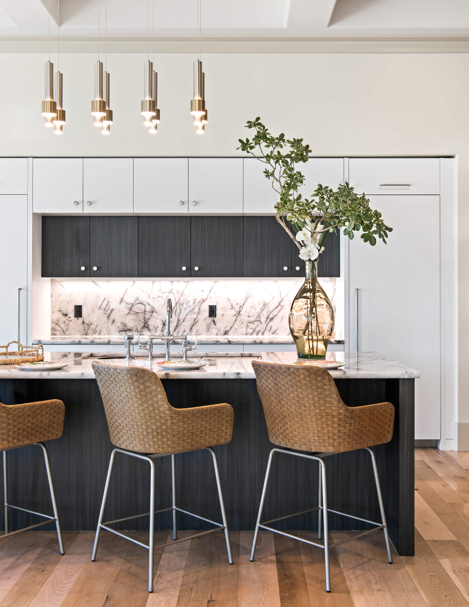 The main level’s great room, stretching nearly sixty feet, is lined with expansive windows that flood the interiors with natural light. The gourmet kitchen blends art and functionality, showcasing a quartzite island, Thermador and AGA appliances, and a discreet butler’s pantry for seamless hosting.